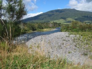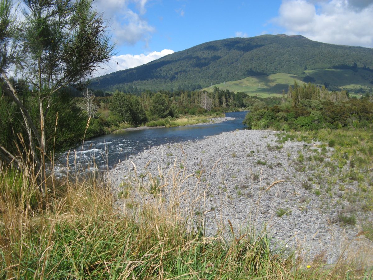 (View from above the Cicada Pool looking up river towards Stag Pool, Mt. Pihanga beyond)