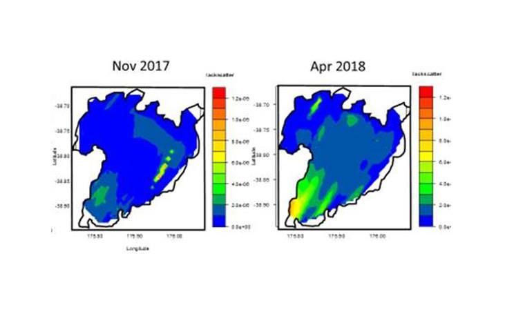In November 2017 the density was very high around Horomatangi, which is consistent with several previous soundings taken at this time of year and reflects the good fishing reported from around the reef last spring.