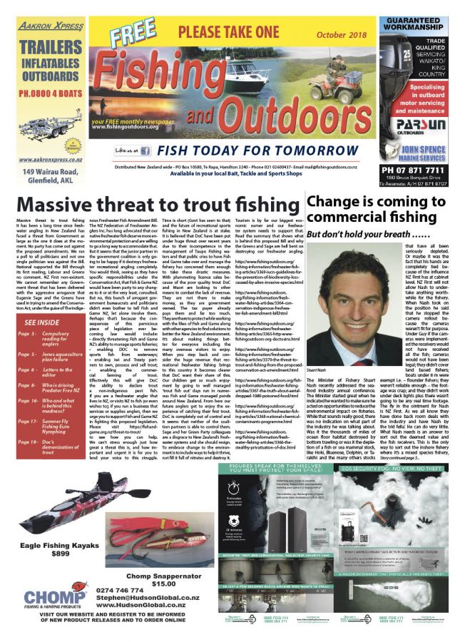 October issue is compulsory reading for anglers…  Anglers have to wonder why there have been no headlines about this “Massive threat to trout fishing” issue (re: proposed amendment to the Conservation Act being sneaked through without any consultation with Fish & Game etc.) in the big daily newspapers?  Or trout fishos opinions do not matter any more?  Something smells fishy…