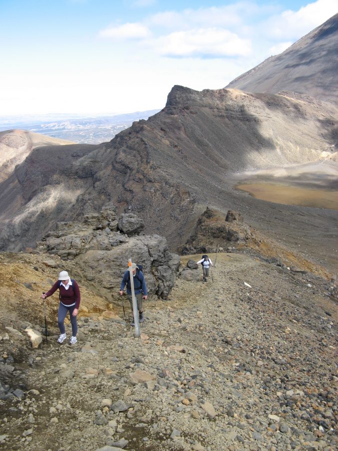 They make a huge difference to assist stability on the track where the surface of loose scoria and pumice can get quite slippery.  Refer image of keen TRM inmate (Hi Wendy) tramping the Tongariro Alpine Crossing – note the walking poles…
