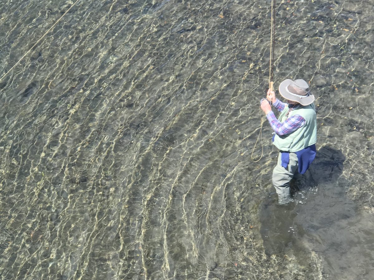 By the time Graham gently waded in he had attracted an admiring audience on the bridge – which did not do anything for concentration or casting. Fortunately Graham was very patient, possibly to make it even harder for us bridge admirers holding our collective breathes, as he quietly waded only shin deep and cast. From his first effort I could see he was in control.. He might even hook it…