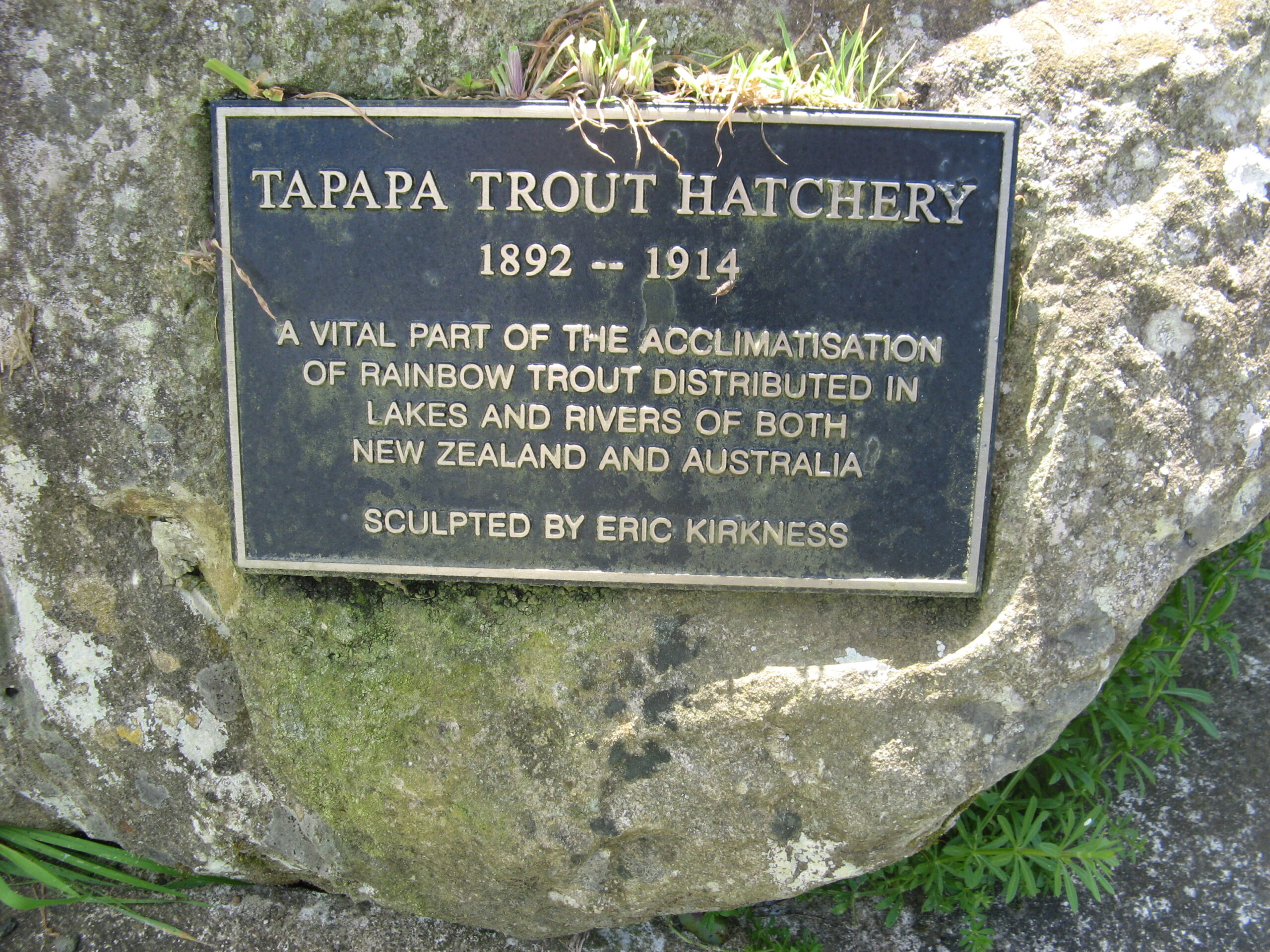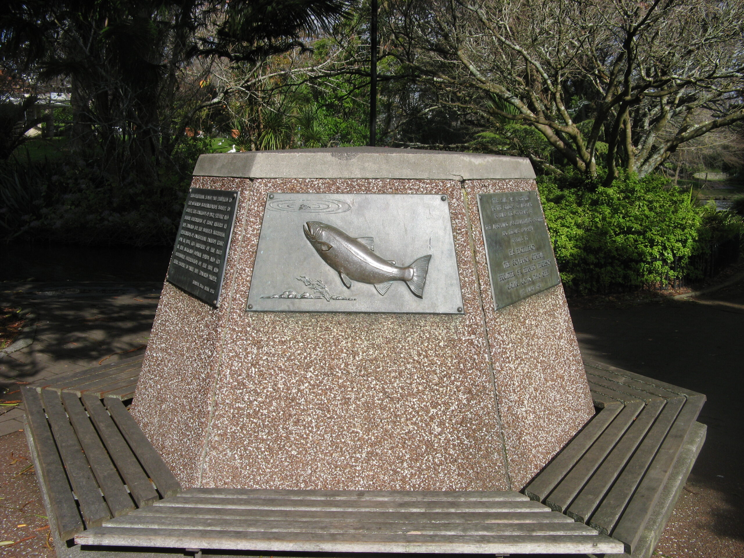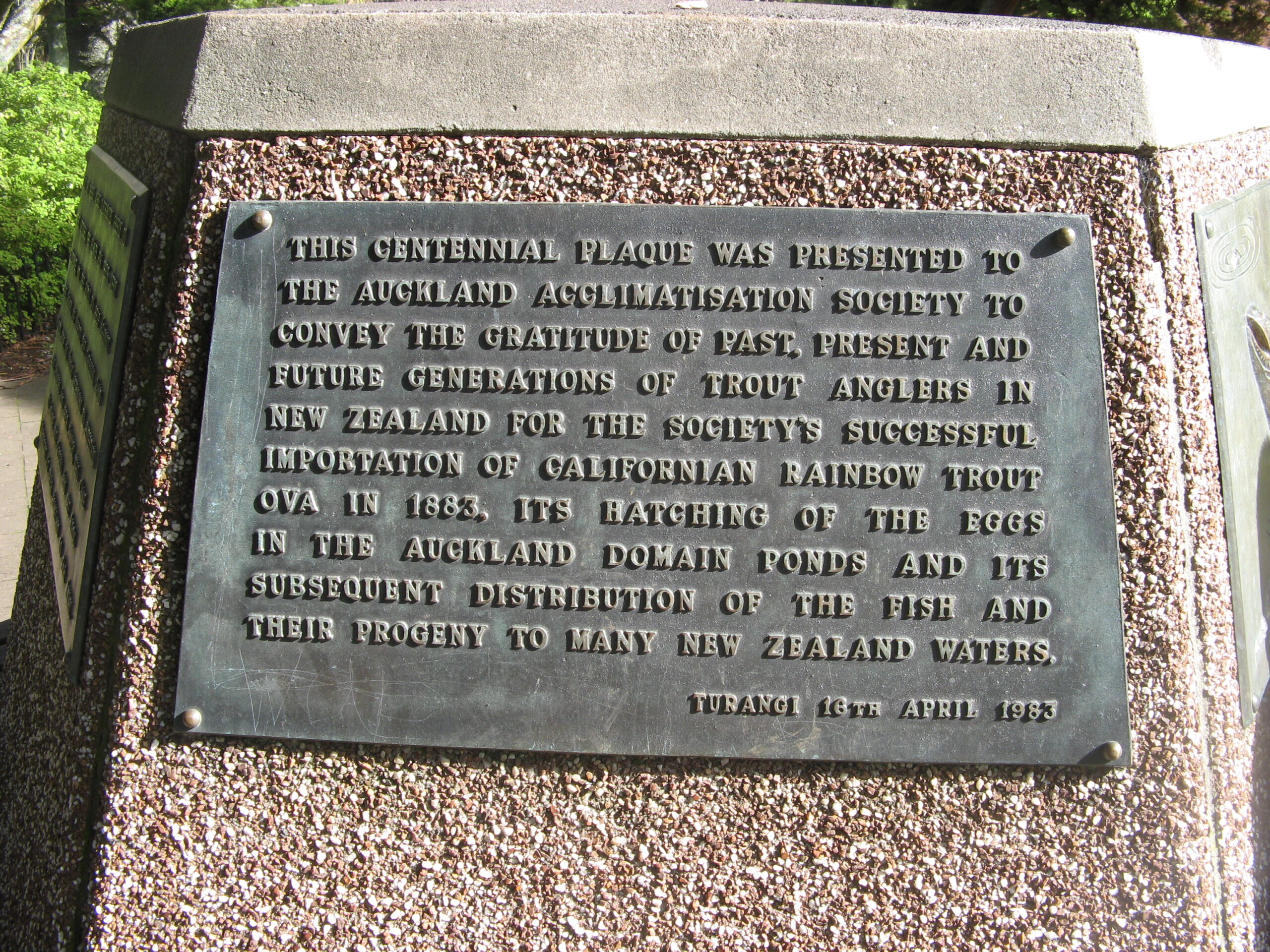 Memorial in Auckland Domain to celebrate the introduction of Rainbow Trout to NZ. The plaque reads: “THIS CENTENNIAL PLAQUE WAS PRESENTED TO THE AUCKLAND ACCLIMATISATION SOCIETY TO CONVEY THE GRATITUDE OF PAST, PRESENT, AND FUTURE GENERATIONS OF TROUT ANGLERS IN NEW ZEALAND FOR THE SOCIETY’S SUCCESSFUL IMPORTATION OF CALIFORNIAN RAINBOW TROUT OVA IN 1883. ITS HATCHING OF THE EGGS IN THE AUCKLAND DOMAIN POND AND ITS SUBSEQUENT DISTRIBUTION OF THE FISH AND THEIR PROGENY TO MANY NEW ZEALAND WATERS.”