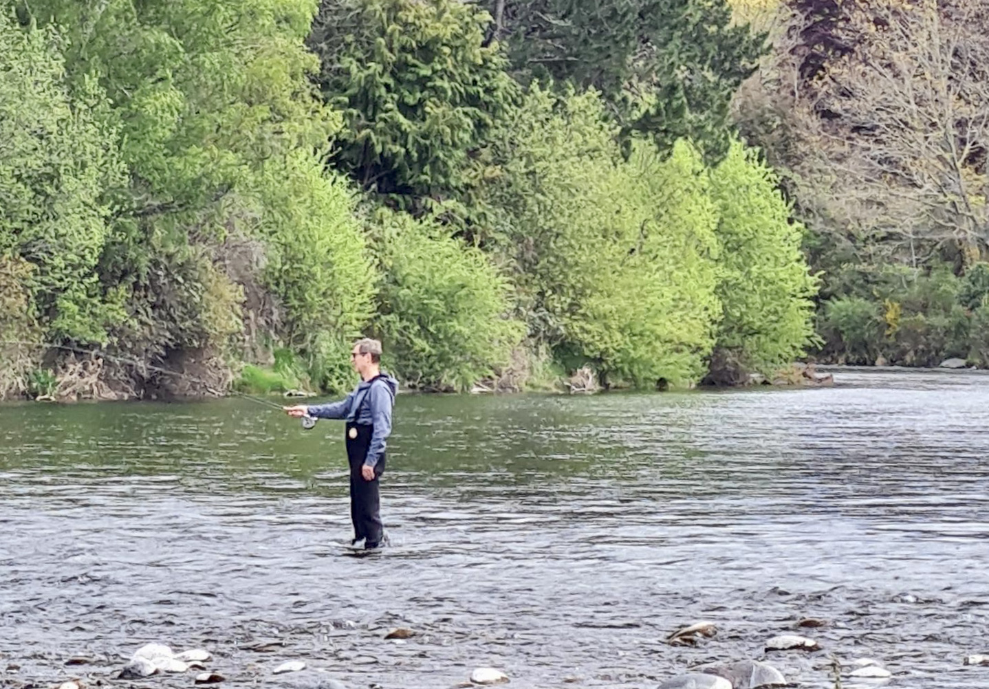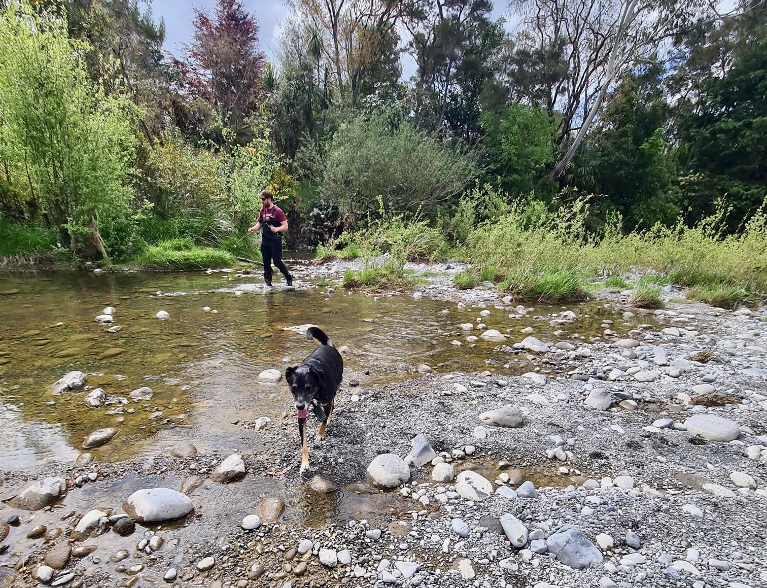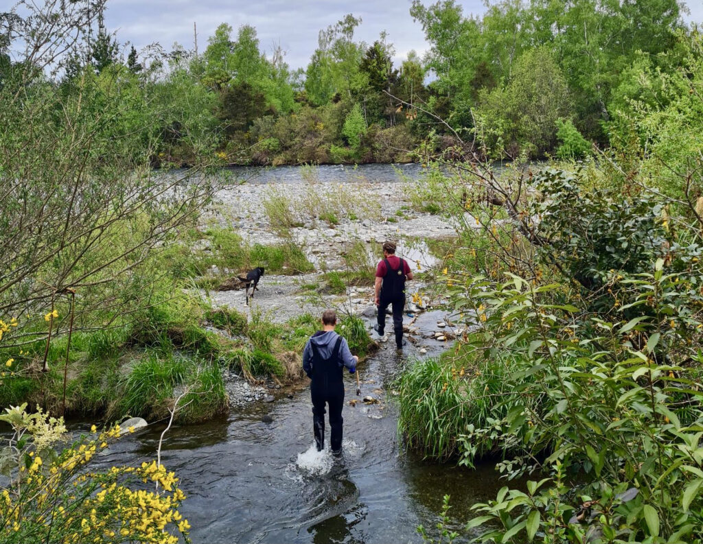Juno guides two new anglers on the Tongariro River:
