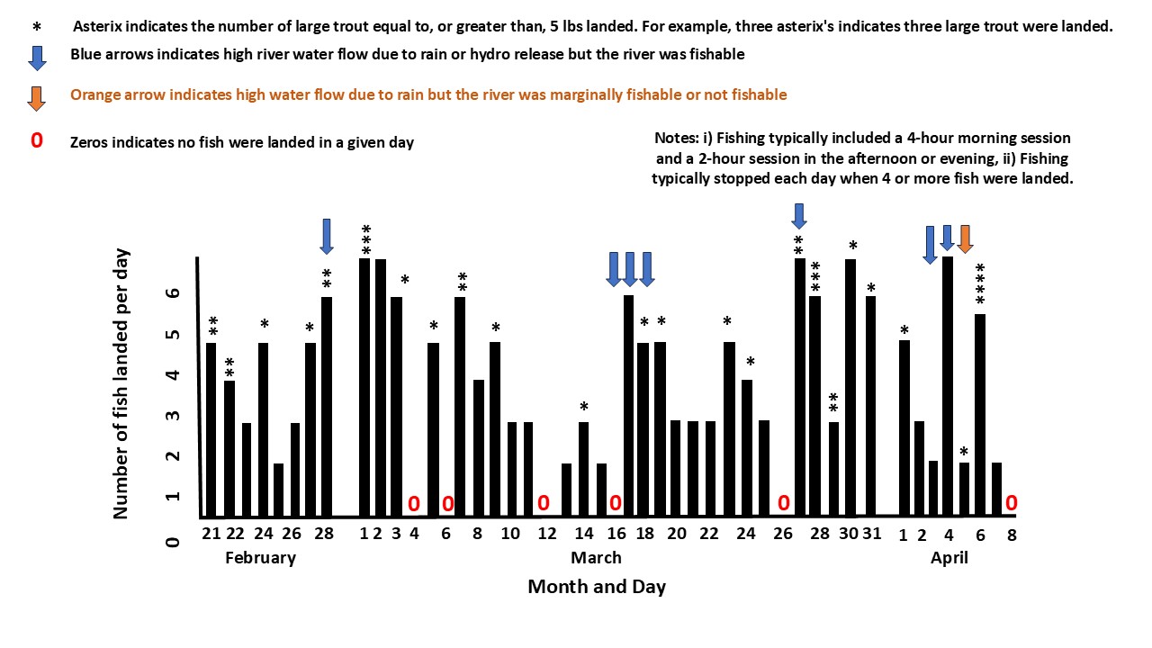 His total catch of 174 over 38 days fishing (excludes the six “0” days) = average 4.5 per day, with 36 over 5 pound!
