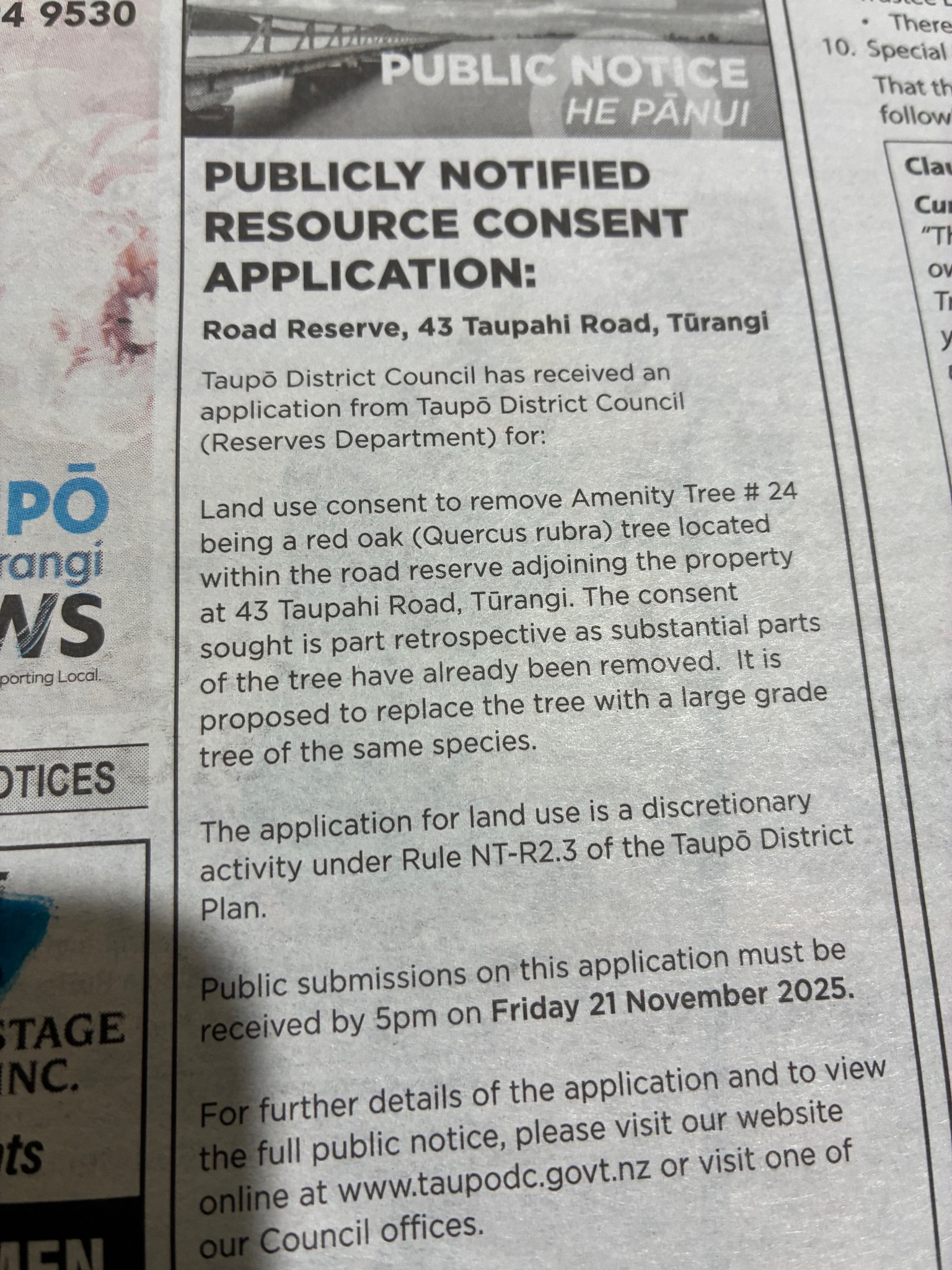 Many tourist visitors and others with holiday homes in the Taupahi Road vicinity could not believe the Council could be so belligerent – to massacre a “registered” protected landmark tree without any forward warning to nearby residents, no consultation, no works plan or order number, etc. The remaining stump is more than an ugly eyesore. It is another clear confirmation of how poorly Toe-paw treats our cute little leafy village of Turangi. Perhaps they were jealous of all the deciduous trees that are such an attractive visual feature marking the seasons in Turangi. It was unforgivable.