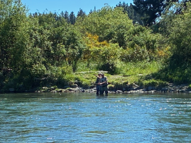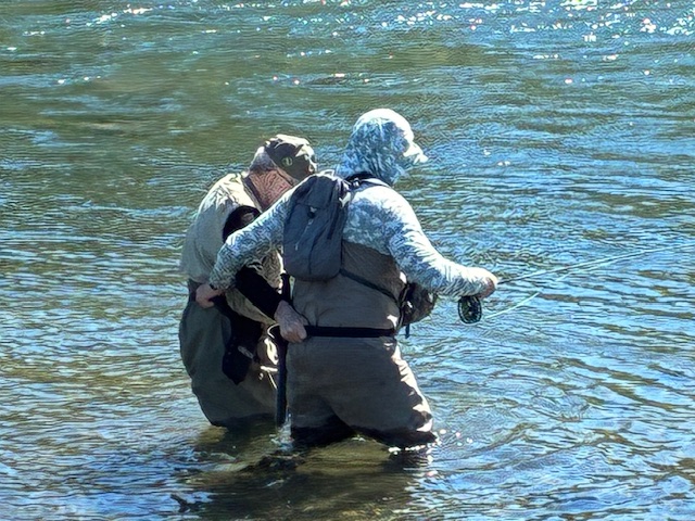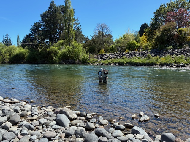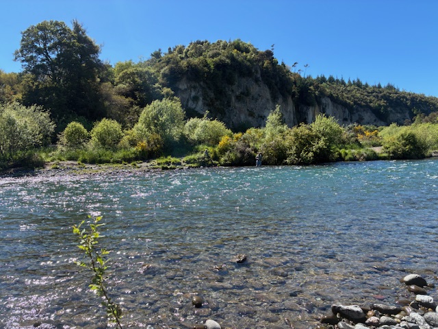 The photos below were taken yesterday near the easily accessible bridge pool on the Tongariro River to illustrate the teamwork involved to wade out and cast to where the trout were waiting (?).