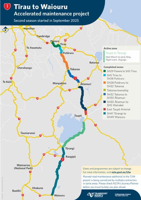 We’re still hard at it on the SH1 Tīrau to Waiouru Accelerated Maintenance project (T2W) and have a lot to celebrate! More than 97 percent of the work has now been completed – just 2 sites remain:Taupō to Tūrangi – Picking up where it left off in late 2025, night work began last Wednesday (18 March) at the SH1/Kiko Road intersection and is expected to take around 8 shifts to complete (weather dependent). Once finished, the crew will move to the southern end of Motuoapa, where approximately 14 night shifts will be required. Work will take place Sunday to Thursday, between 7pm and 6am, under stop/go traffic management. Outside of these hours, the road will remain open to traffic, with temporary speed restrictions in place.
