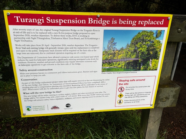 Access to the Major Jones Pool, the most popular fishing pool on the river, may be difficult for anglers, bikers and walkers. The existing bridge has been blocked off from 20 April at the eastern end for construction of the replacement bridge. The Major Jones Pool could still be accessed from the Northern SH 1 end, but that would require walking past Judges’ Pool, which may be too much to ask. The popular 3 km circuit at the northern end of the Tongariro Trail may be blocked off until construction is finished.