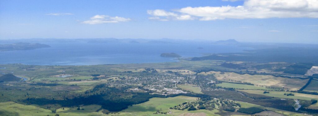 …. If anywhere can claim to be trophy territory, it is Taupo. The lake that gives its name to the region and town is the largest lake in Australasia. It is the size of Singapore and contains 60 cubic kilometres of water—enough to cover the land area of the North Island to a depth of half a metre. The lake is the caldera of an ancient volcano which last erupted in 186 A.D. This blow-out is considered to be the most violent in Earth’s recent history, but it was only a fraction of the magnitude of many previous Taupo eruptions. One in 20,000 B.C. covered the Chatham Islands, more than 800 km away, with a layer of ash 12 cm thick. Another produced enough pumice to fill the present lake twice.