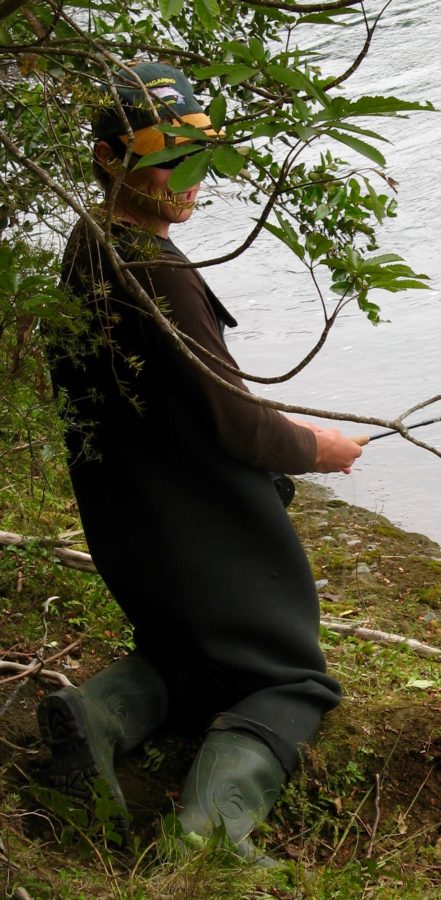 Jerry was kneeling precariously on a narrow ledge, perched just above the river about 3-4 metres up river from Helena. His outline so close to the flow was even disguised by bushes he had planted. His patience was rewarded. I have never seen anyone fishing that spot before or after.