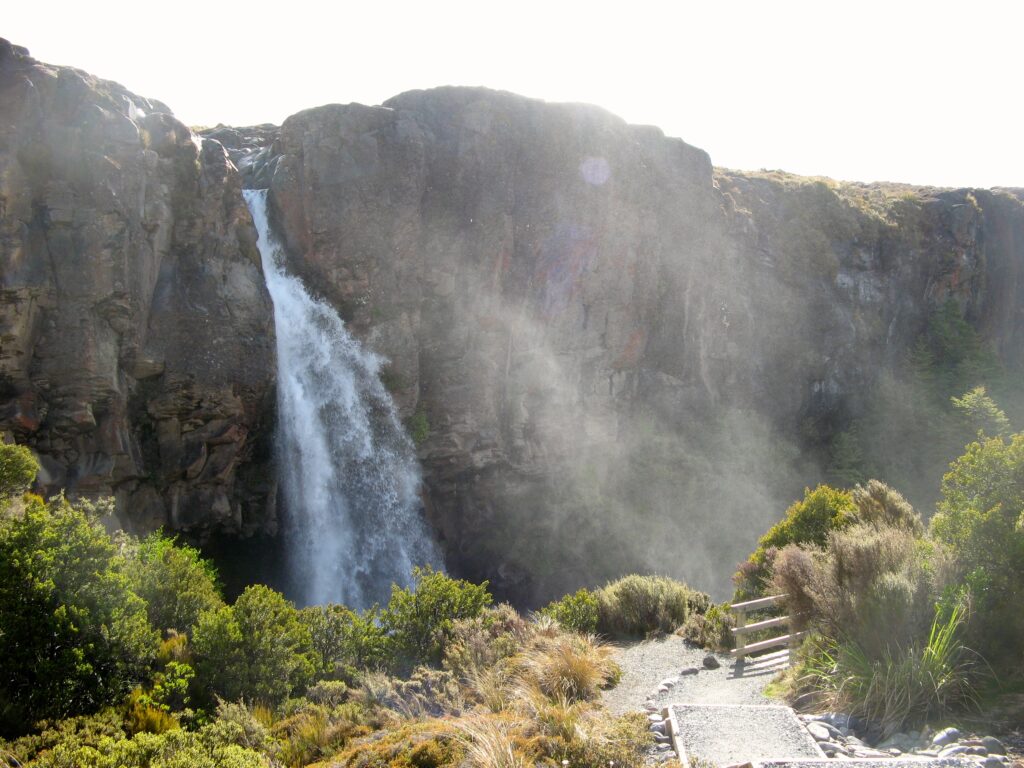 Taranaki Falls accessed from the short street immediately behind the Chateau. This provides a two hour loop walk in the clockwise direction combines a bush walk to a spectacular waterfall and a more exposed alpine walk to return. Don’t forget to walk under the waterfall as well! There are a choice of cafes at Whakapapa to help your recovery.