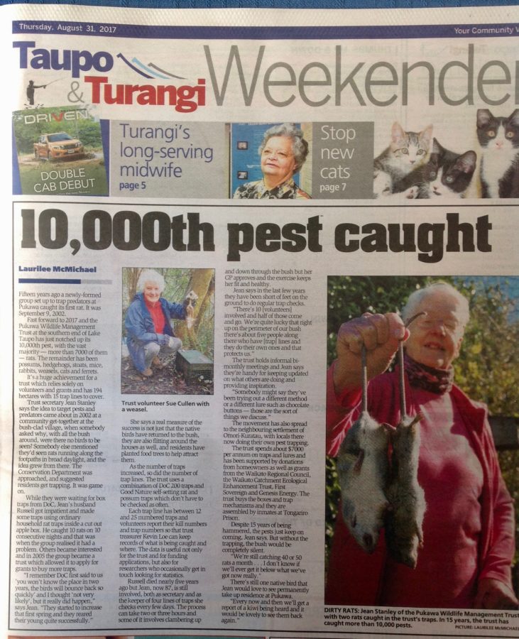 Fast forward to 2017 and the Pukawa Wildlife Management Trust at the southern end of Lake Taupo has just notched up its 10,000th pest with the vast majority – more than 7000 of them – rats.