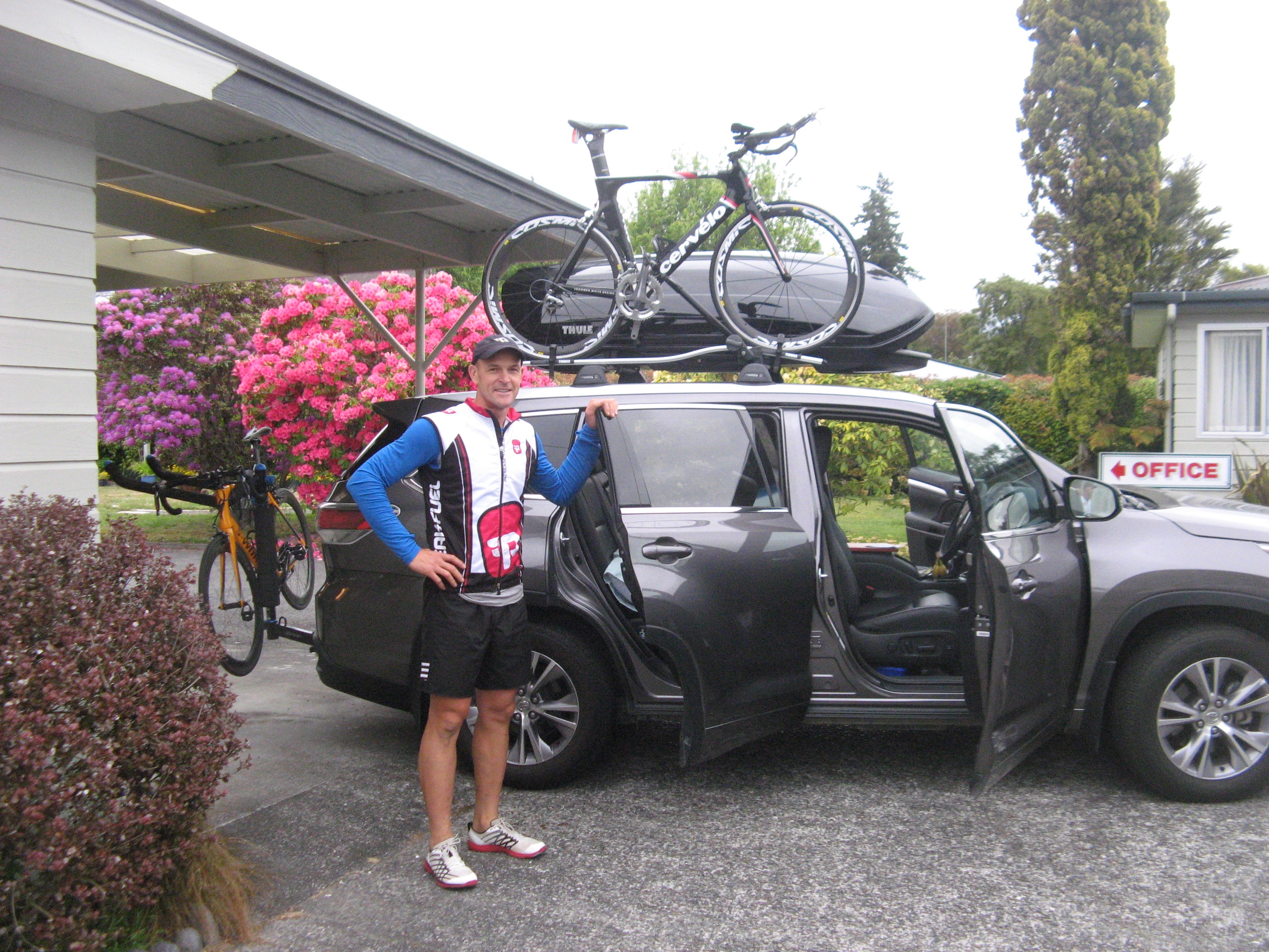 I’ll be looking out for Cliff Kingston from Tauranga – 70 years young,. He has a new faster lighter carbon bike with all the bells and whistles this year. His last bike fell apart after it had done over 96,000 km… He will be wearing lycra so he should be easy to spot.