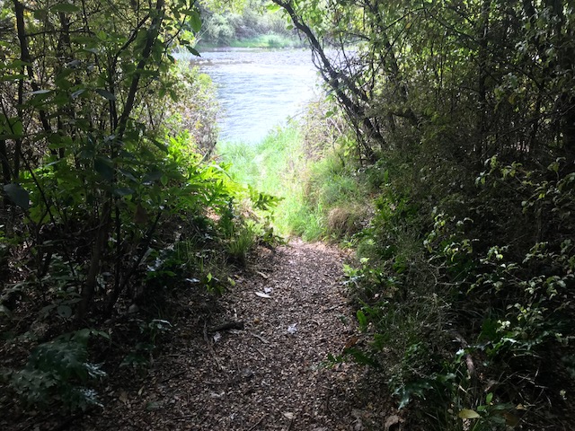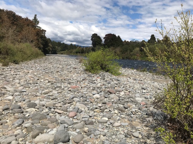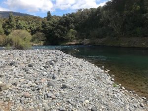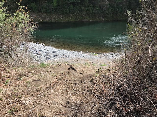 The other images below on right illustrate the new access track to Cattle Rustlers.  The old track used to emerge on the river bank requiring wading to reach the corner of Cattle Rustlers Pool.  The new track has been cut through the blackberry upstream to emerge on the bank.  So bikers and trampers can now have a picnic on the bank without having to wade.