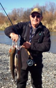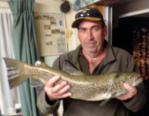 Harvey Clark on right with another prime conditioned 5 pound fresh run Tongariro Rainbow trout.