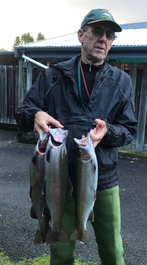 Above on right is an ecstatic inmate, Wayne Godkin, with his haul from Saturday morning wet lining the Braids.  His catch is more typical of excellent trout condition seen returned to TRM smoker during last week.