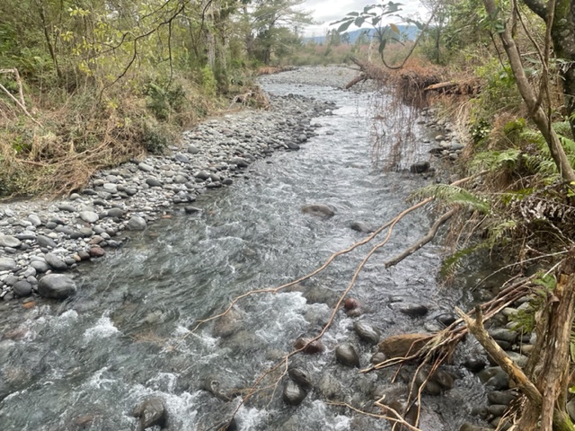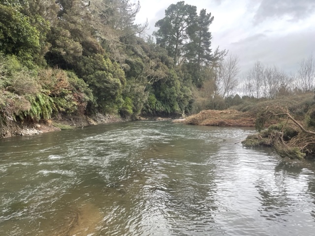 .Recognise this fishy stream? Photos taken yesterday are a new bypass stream with sufficient flow velocity and energy to try to qualify as a river, that has appeared since the flood last week. It is anticipated by some anglers that with successive floods, this will gradually gouge out deeper and soon become the main river from below the Cliff Pool to emerge in the Poutu Stream above the Poutu Pool. Confused? Read on…
