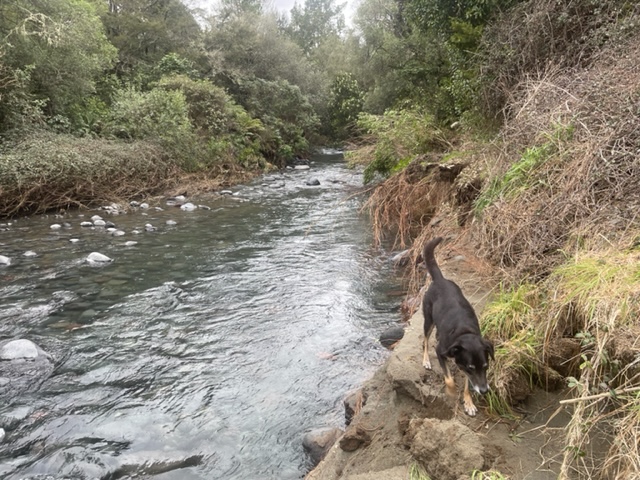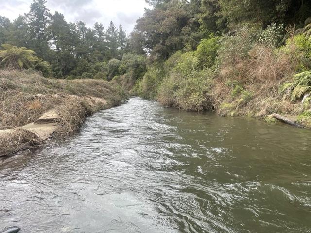 Looking back up the poutu Stream still overgrown but wadeable.