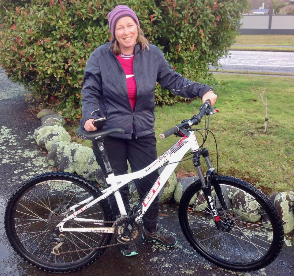 Above is a brave biker – Sarah Tomsett from Waihi Beach – still smiling after completing the 15km Tongariro River Trail in cold wet miserable conditions yesterday – on 12 August.