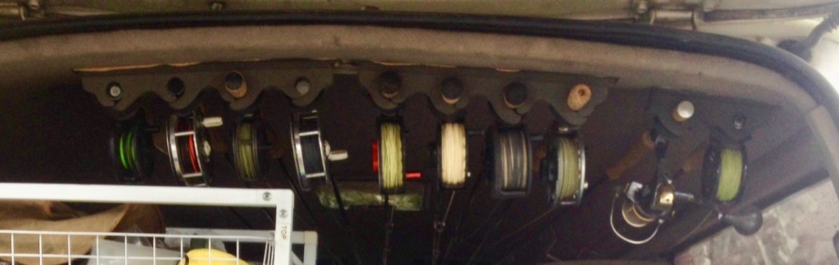 The image is the ceiling or inside the roof of a van belonging to Miles from Taranaki. He has been a regular visitor to the Tongariro River since before Turangi was created. His array of evil weapons of mass destruction to provide for every eventuality in every pool or run or reach on the Tongariro is most impressive.