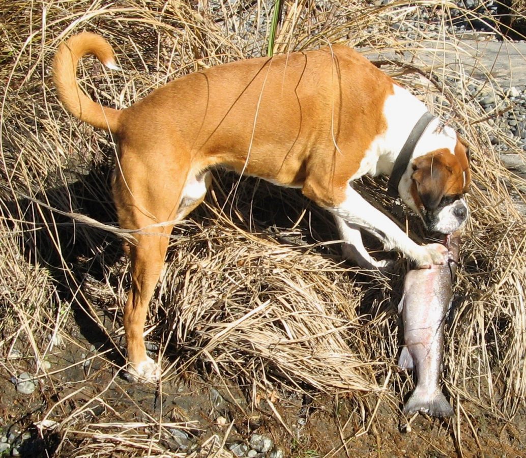 Pumpkin had big boots to fill when she succeeded Boof – TRM’s original guard dog. Boof – on right – was famous for his trout catching ability.