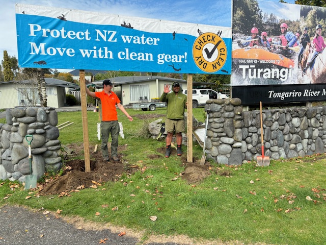DOC have been rightly concerned about their signs getting trashed. A common problem everywhere. The third time they replaced their Didymo awareness sign on the SH1 corner, it was mounted so high that the kids could not reach it.