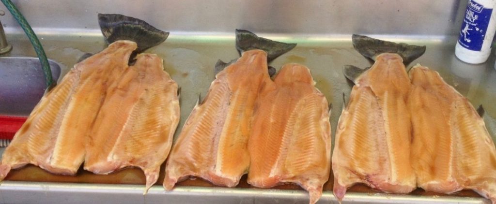 The pin bones along the flank pull out easily once the trout is smoked. The other side – on the side with the backbone intact – can be lifted out complete with the back bone to leave boneless fillets. The image below shows thirty boneless fillets which is about full capacity for TRM’s electric smoker. If you lean forward and concentrate you should almost smell their tangy fresh taste – so moorish…
