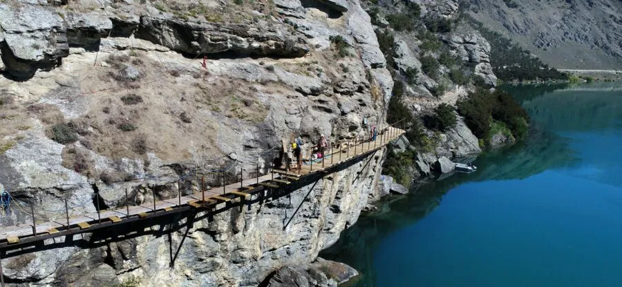 For the 2024 update – The photos below have been added to illustrate how to overcome one of the impossible (?) hurdles that TDC planners mentioned previously – with a “clip-on” path for bikers around Bulli Point. These photos are from Lake Dunstan where a new trail was formed between Cromwell and Clyde about two years ago – since the previous Taupo submission. That trail was delayed for years while the Trust tried to convince DOC and their council of the financial viability. It has since been an outstanding tourist success exceeding all their forecasts.