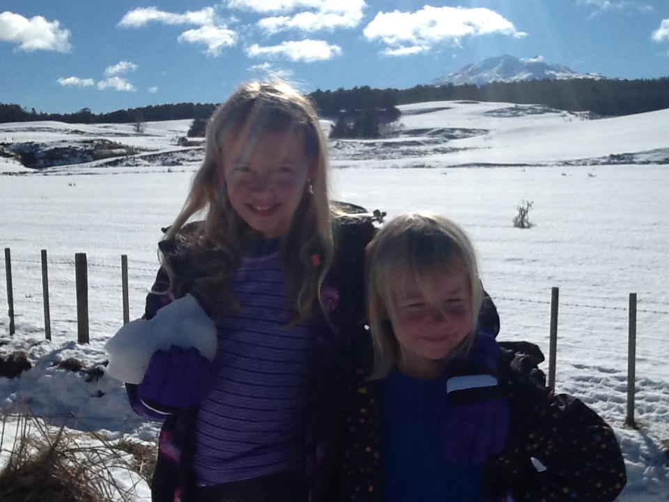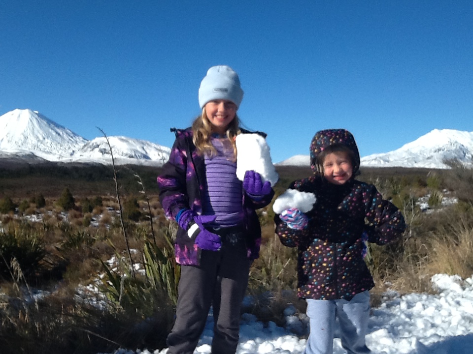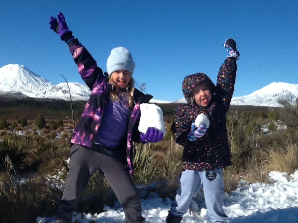 Ishel Suter (age 9) & Ari Suter (6) from Te Miro (A rural village north of Cambridge – in case, like me, you did not know) enjoying frolics in the snow on the Central Plateau.