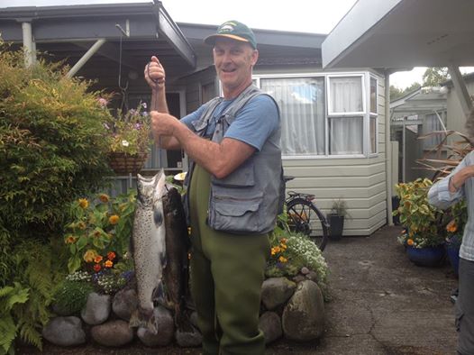 Denis Renard from New Caledonia with his limit bag of two BIG brown trout and a rainbow trout from the Bridge Pool after the rain on Friday.