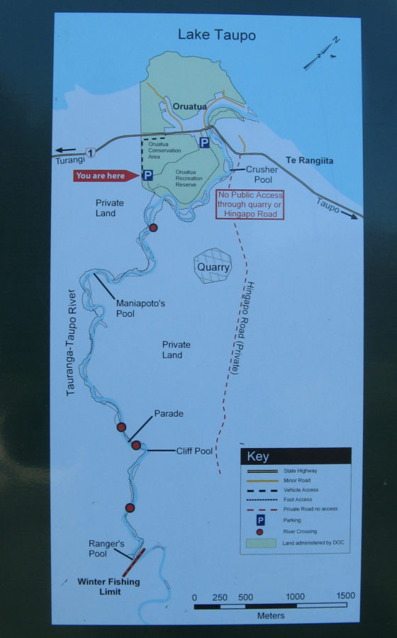 If the car park is full then it is also ‘fishable’ by casting directly from the curved Heuheu Parade – the road on the TLB leading from SH1 to the mouth at Oruatua. But you may need a long handle landing net to land them and need to keep a wary lookout for traffic driving through your back-cast.