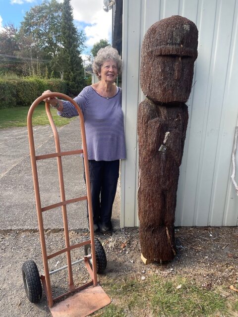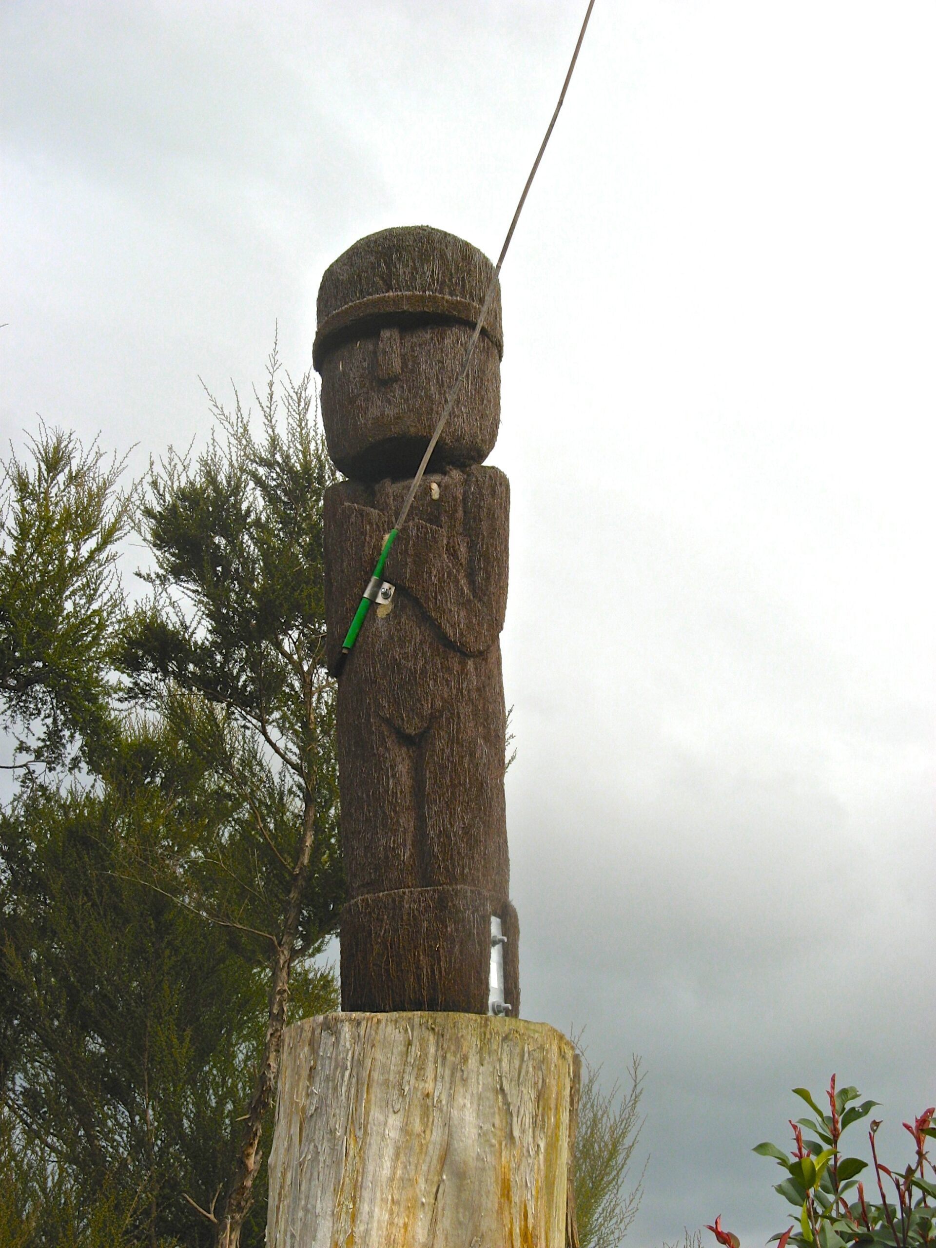 The ponga statue of an angler guarding the Piri Road entrance to TRM has finally fallen. He was originally erected on the top of the trunk of an old gum tree that was cut down about 2005. The staff christened the statue “Wayne” for some forgotten reason although his gender was not that obvious.