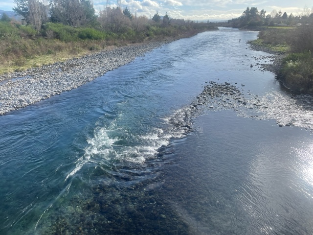 The most recent photos below were taken midday Sunday with the flow around 27.5 cumecs. A fast current has gouged out a deeper ditch in the middle of the river where it is impossible to get a line down to where the fish are sneaking through on their spawning runs underneath the fast water.